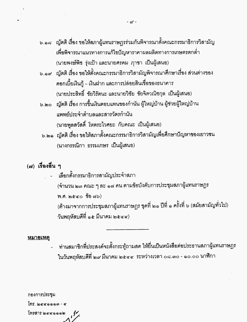 ระเบียบวาระการประชุมสภาผู้แทนราษฎร ชุดที่ ๒๑ ปีที่ ๑ ครั้งที่ ๑๐ (สมัยสามัญทั่วไป) วันพฤหัสบดีที่ ๒๙ มีนาคม ๒๕๔๔ |
