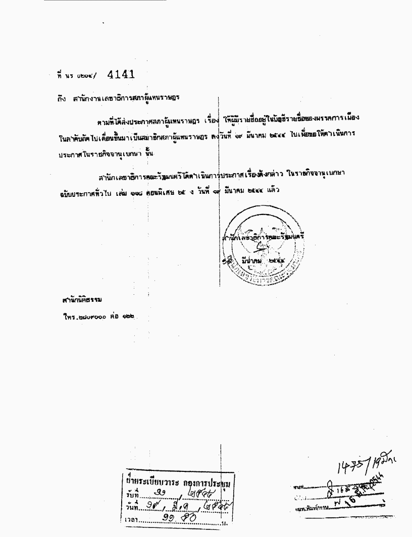 • ประกาศสภาผู้แทนราษฎร เรื่อง ให้ผู้มีรายชื่ออยู่ในบัญชีรายชื่อของพรรคการเมืองในลำดับถัดไปเลื่อนขึ้นมาเป็นสมาชิกสภาญ้แทนราษฎร