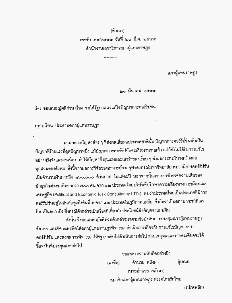 ขอเสนอญัตติด่วน เรื่อง ขอให้รัฐบาลเร่งแก้ไขปัญหาการคอร์รัปชัน |