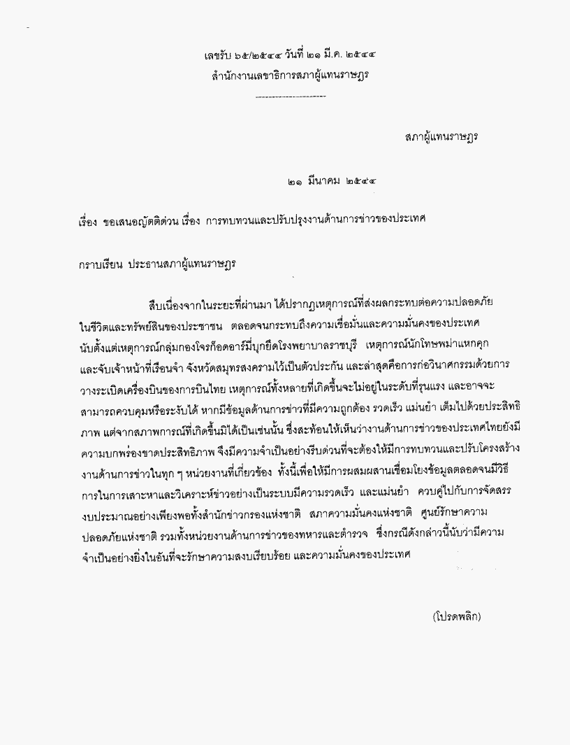 ขอเสนอญัตติด่วน เรื่อง การทบทวนและปรับปรุงงานด้านการข่าวของประเทศ |