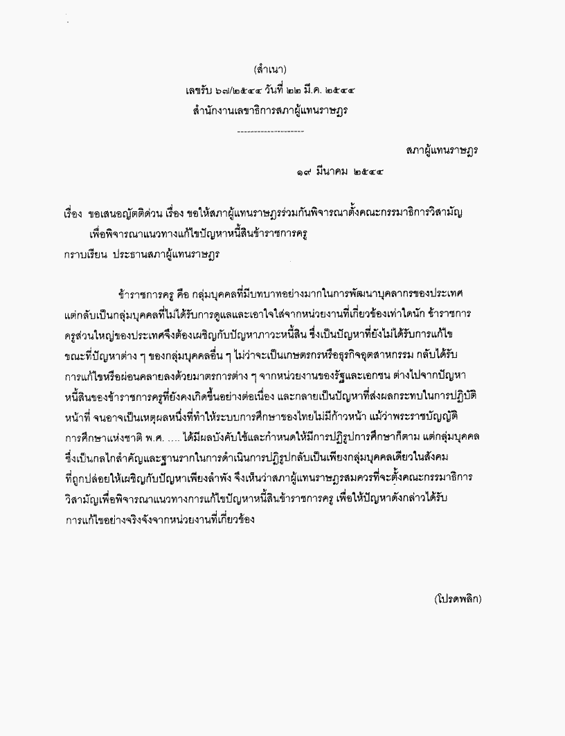 • ขอเสนอญัตติด่วน เรื่อง ขอให้สภาผู้แทนราษฎรร่วมกันพิจารณาตั้งคณะกรรมาธิการวิสามัญเพื่อพิจารณาแนวทางแก้ไขปัญหาหนี้สิน ข้าราชการครู