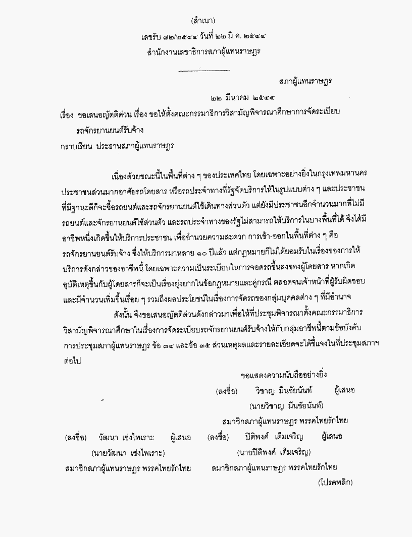 ขอเสนอญัตติด่วน เรื่อง ขอให้ตั้งคณะกรรมาธิการวิสามัญพิจารณาศึกษาการจัดระเบียบรถจักรยานยนต์รับจ้าง |