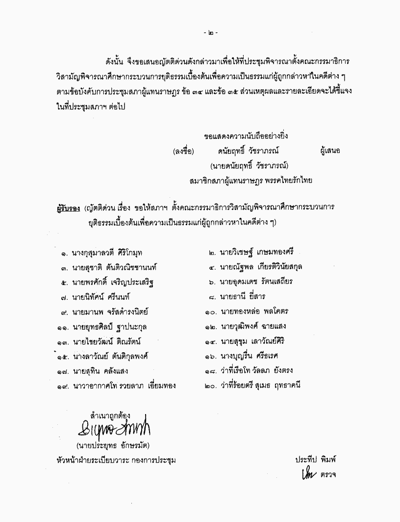 • ขอเสนอญัตติด่วน เรื่อง ขอให้สภาฯ ตั้งกรรมาธิการวิสามัญพิจารณาศึกษากระบวนการยุติธรรมเบื้องต้นเพื่อความเป็นธรรมแก่ผู้ถูกกล่าวหาในคดีต่าง ๆ