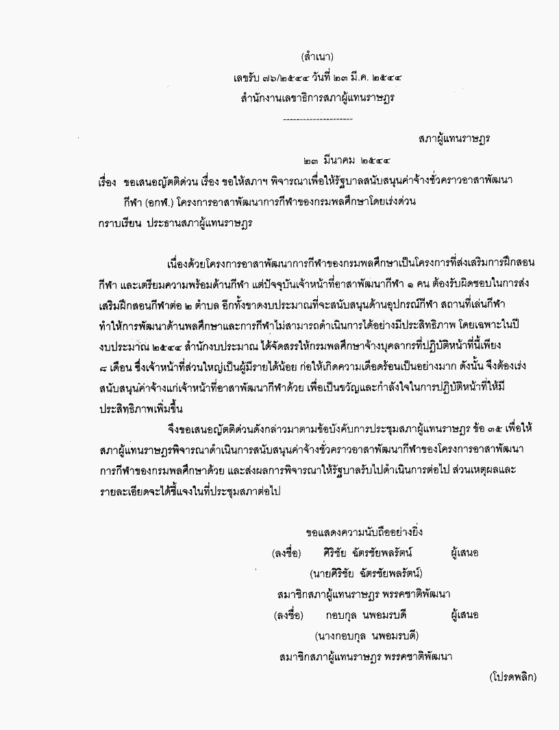 • ขอเสนอญัตติด่วน เรื่อง ขอให้สภาฯ พิจารณาเพื่อให้รัฐบาลสนับสนุนค่าจ้างชั่วคราวอาสาพัฒนากีฬา (อกฬ.) โครงการอาสาพัฒนาการกีฬาของกรมพลคึกษาโดยเร่งด่วน