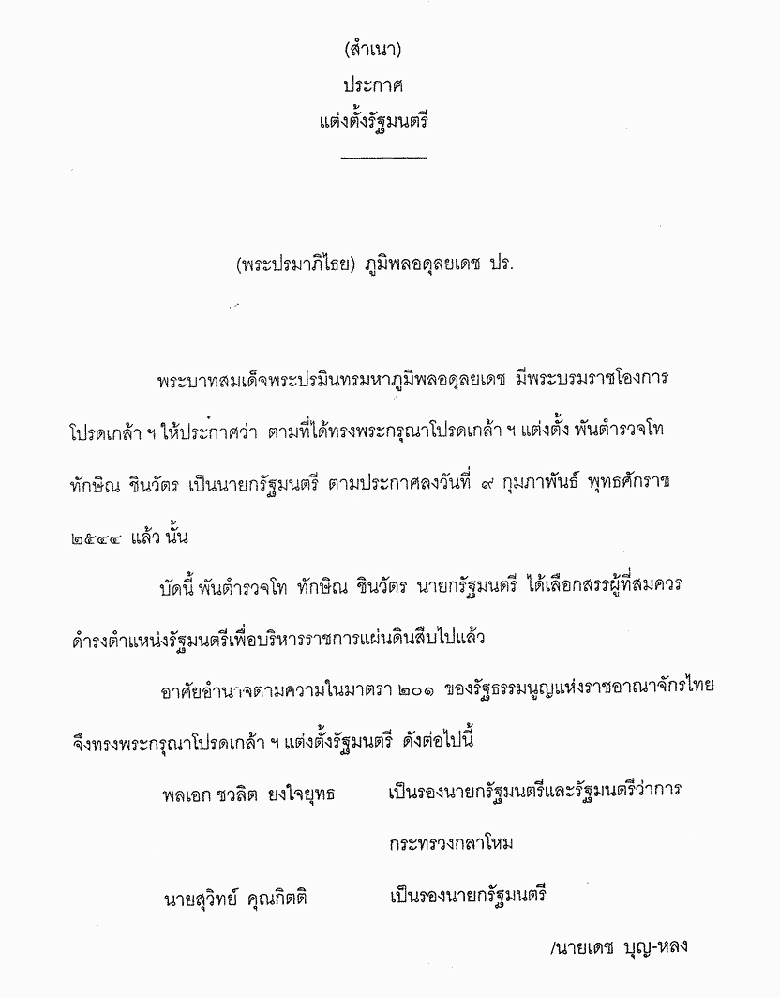 • ประกาศ แต่งตั้งนายกรัฐมนตรี