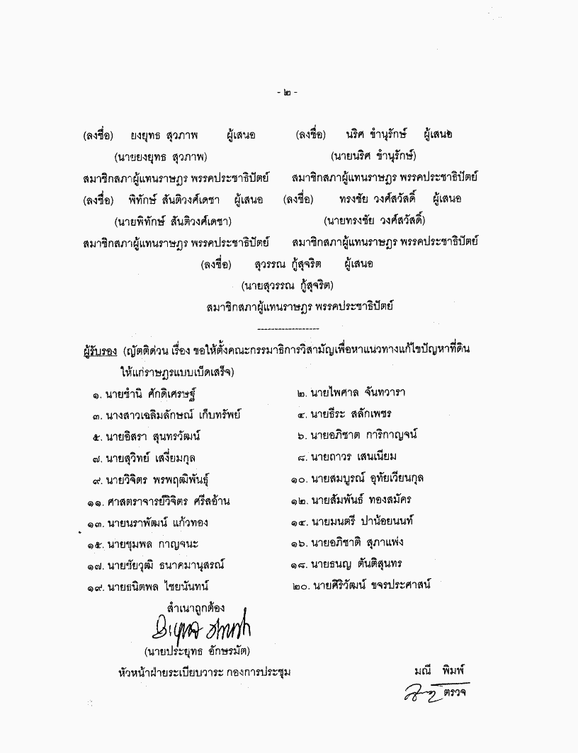 ขอเสนอญัตติด่วน เรื่อง ขอให้ตั้งคณะกรรมาธิการวิสามัญเพื่อหาแนวทางแก้ไขปัญหาที่ดินให้แก่ราษฎรแบบเบ็ดเสร็จ |