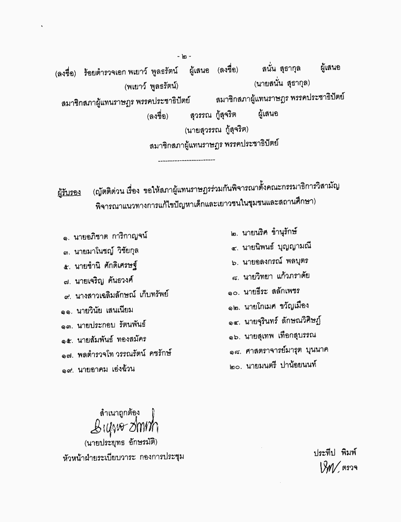 ขอเสนอญัตติด่วน เรื่อง ขอให้สภาผู้แทนราษฎรร่วมกันพิจารณาตั้งคณะกรรมาธิการวิสามัญพิจารณาแนวทางการแก้ไขปัญหาเด็กและเยาวชนในชุมชนและสถานศึกษา |
