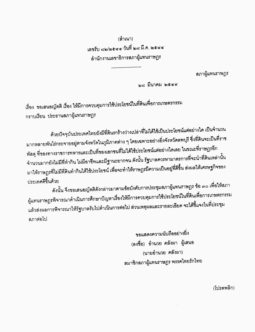 • ขอเสนอญัตติ เรื่อง ให้มีการควบคุมการใช้ประโยชน์ในที่ดินเพื่อการเกษตรกรรม