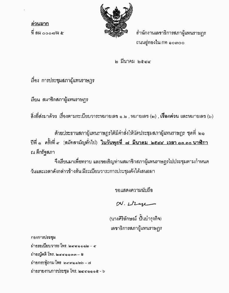 • ระเบียบวาระการประชุมสภาผู้แทนราษฎร ชุดที่ ๒๑ ปีที่ ๑ ครั้งที่ ๔ (สมัยสามัญทั่วไป) วันพุธที่ ๗ มีนาคม ๒๕๔๔
