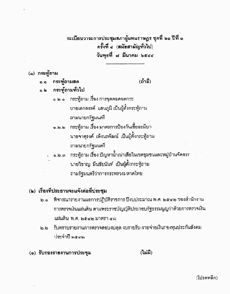 ชื่อเอกสาร : ระเบียบวาระการประชุมสภาผู้แทนราษฎร ชุดที่ ๒๑ ปีที่ ๑ ครั้งที่ ๔ (สมัยสามัญทั่วไป) วันพุธที่ ๗ มีนาคม ๒๕๔๔