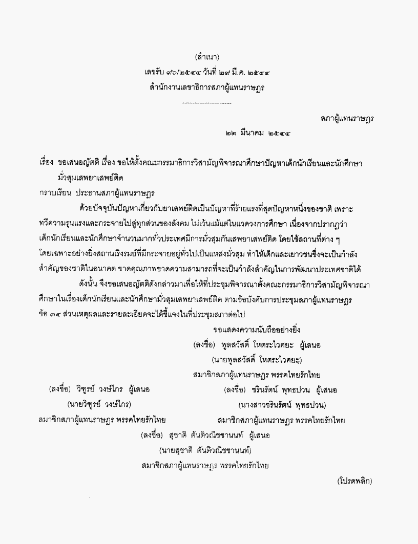 • ขอเสนอญัตติ เรื่อง ขอให้ตั้งคณะกรรมาธิการวิสามัญพิจารณาศึกษาปัญหาเด็กนักเรียนและนักศึกษามั่วสุมเสพยาเสพย์ติด