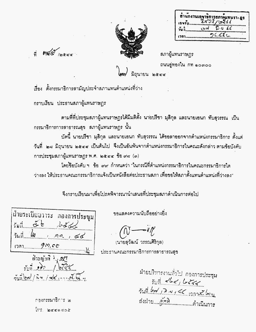 ตั้งซ่อมกรรมาธิการสามัญประจำสภาในคณะกรรมาธิการการสาธารณสุขแทนตำแหน่งที่ว่างลง ๒ ตำแหน่ง (นายปรีชา มุสิกุล และนายเอนก ทับสุวรรณ ลาออก) |