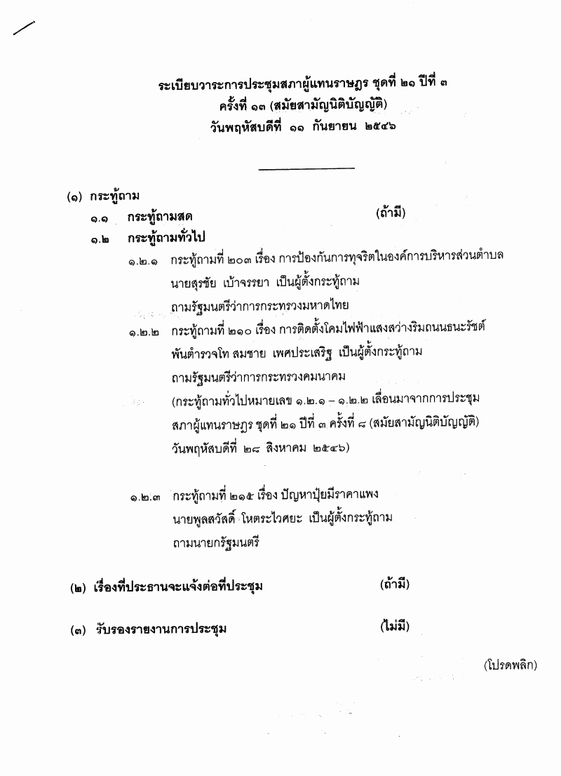 ระเบียบวาระการประชุมสภาผู้แทนราษฎร ชุดที่ ๒๑ ปีที่ ๓ ครั้งที่ ๑๓ (สมัยสามัญนิติบัญญัติ) |
