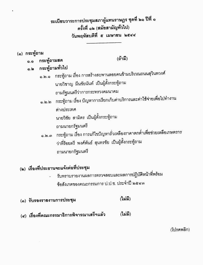 • ระเบียบวาระการประชุมสภาผู้แทนราษฎร ชุดที่ ๒๑ ปีที่ ๑ ครั้งที่ ๑๒ (สมัยสามัญทั่วไป) วันพฤหัสบดีที่ ๕ เมษายน ๒๕๔๔