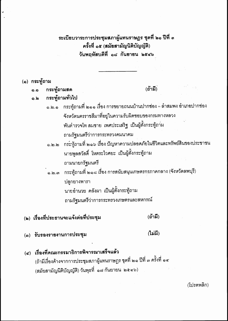 ระเบียบวาระการประชุมสภาผู้แทนราษฎร ชุดที่ ๒๑ ปีที่ ๓ ครั้งที่ ๑๕ (สมัยสามัญนิติบัญญัติ) วันพุธที่ ๑๘ กันยายน ๒๕๔๖ |