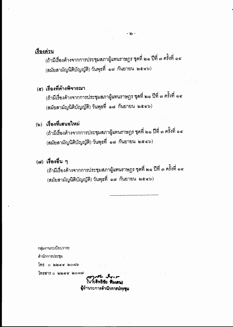 • ระเบียบวาระการประชุมสภาผู้แทนราษฎร ชุดที่ ๒๑ ปีที่ ๓ ครั้งที่ ๑๕ (สมัยสามัญนิติบัญญัติ) วันพุธที่ ๑๘ กันยายน ๒๕๔๖