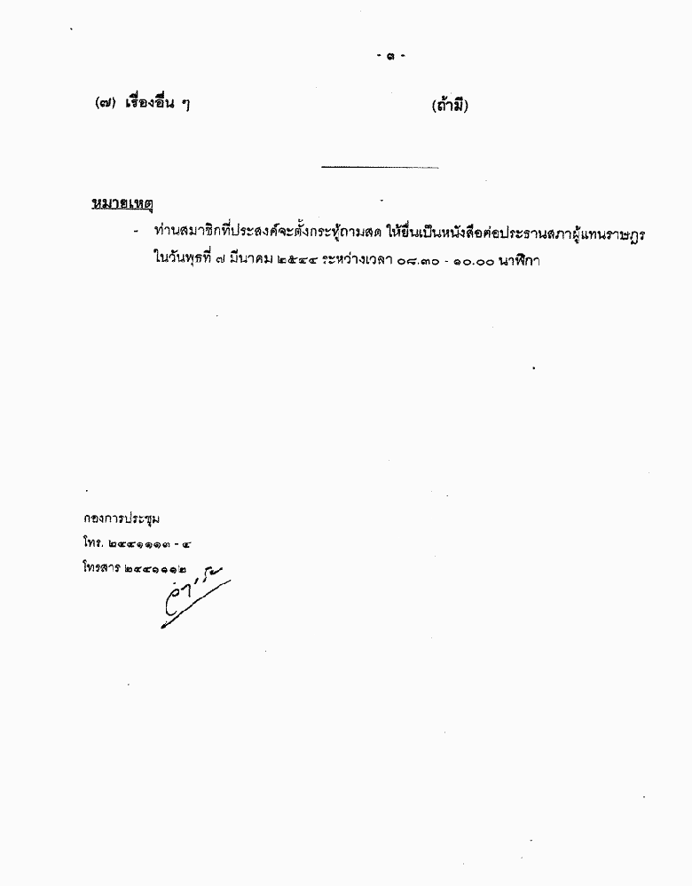 • ระเบียบวาระการประชุมสภาผู้แทนราษฎร ชุดที่ ๒๑ ปีที่ ๑ ครั้งที่ ๔ (สมัยสามัญทั่วไป) วันพุธที่ ๗ มีนาคม ๒๕๔๔