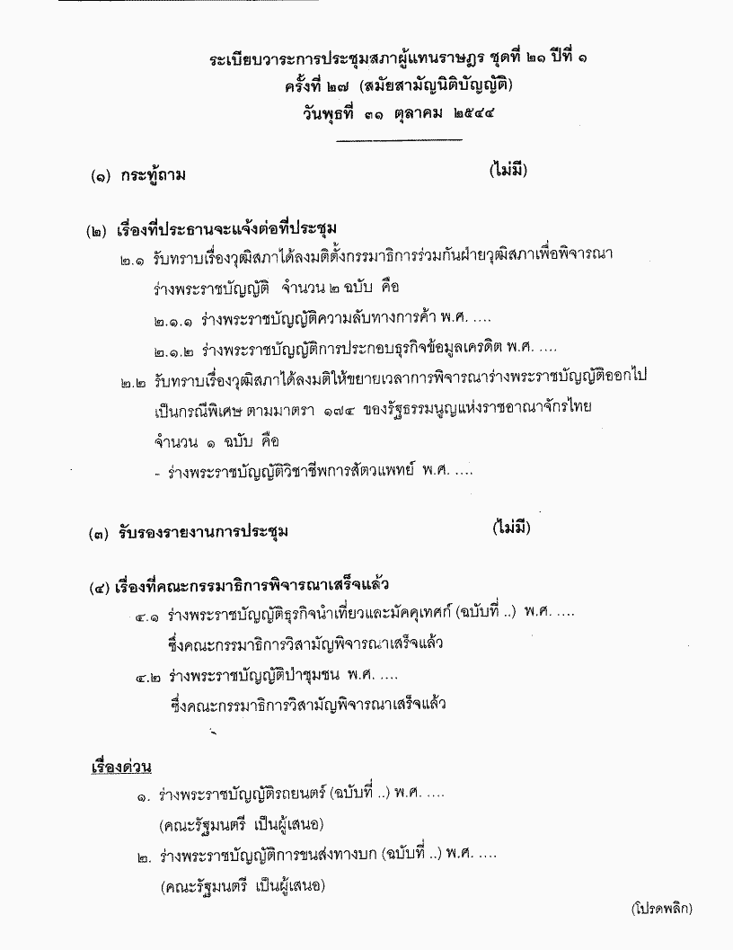 • ระเบียบวาระการประชุมสภาผู้แทนราษฎร ชุดที่ 21 ปีที่ 1 ครั้งที่ 27 (สมัยสามัญนิติบัญญัติ) วันพุธที่ 31 ตุลาคม 2544