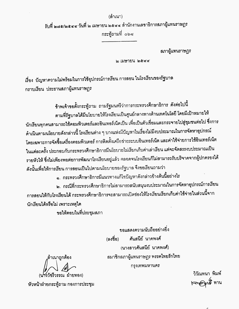 กระทู้ถามที่ 068 เรื่อง ปัญหาความไม่พร้อมในการใช้อุปกรณ์การเรียนการสอน ในโรงเรียนของรัฐบาล นางสาวศันสนีย์ นาคพงศ์ เป็นผู้ตั้งกระทู้ถาม ถามรัฐมนตรีว่าการกระทรวงศึกษาธิการ |