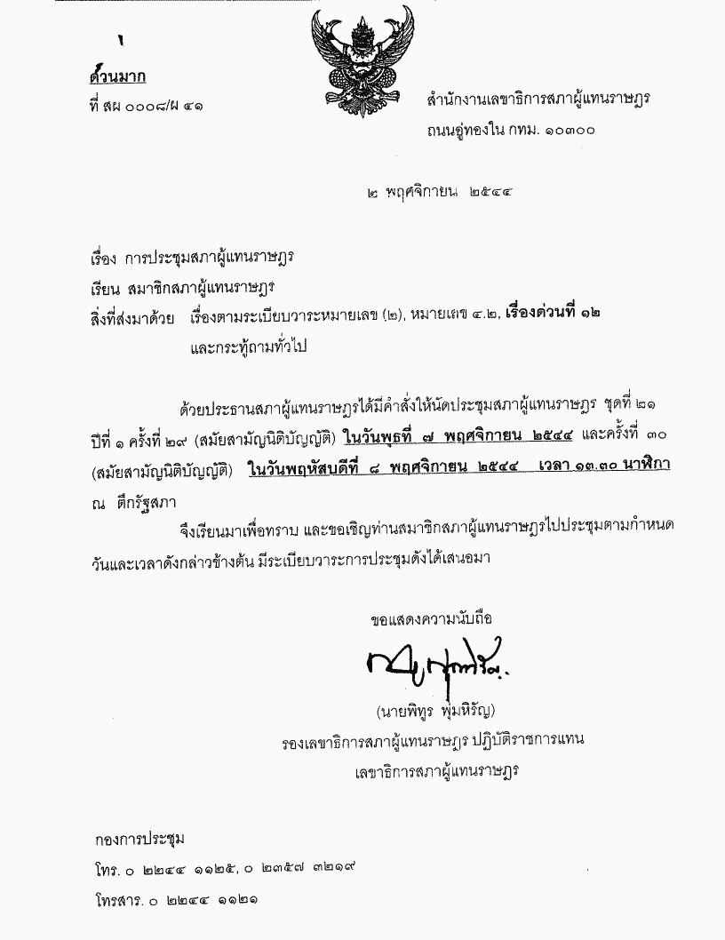 • ระเบียบวาระการประชุมสภาผู้แทนราษฎร ชุดที่ 21 ปีที่ 1 ครั้งที่ 29 (สมัยสามัญนิติบัญญัติ) วันพุธที่ 7 พฤศจิกายน 2544
