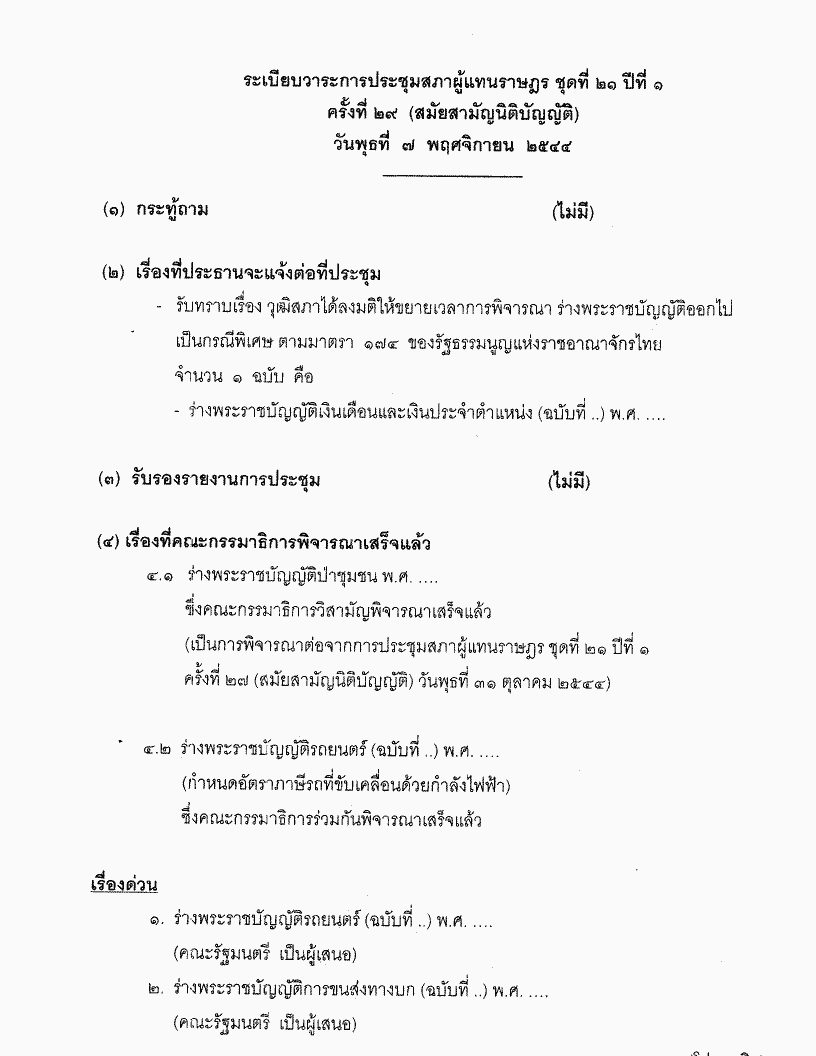 • ระเบียบวาระการประชุมสภาผู้แทนราษฎร ชุดที่ 21 ปีที่ 1 ครั้งที่ 29 (สมัยสามัญนิติบัญญัติ) วันพุธที่ 7 พฤศจิกายน 2544