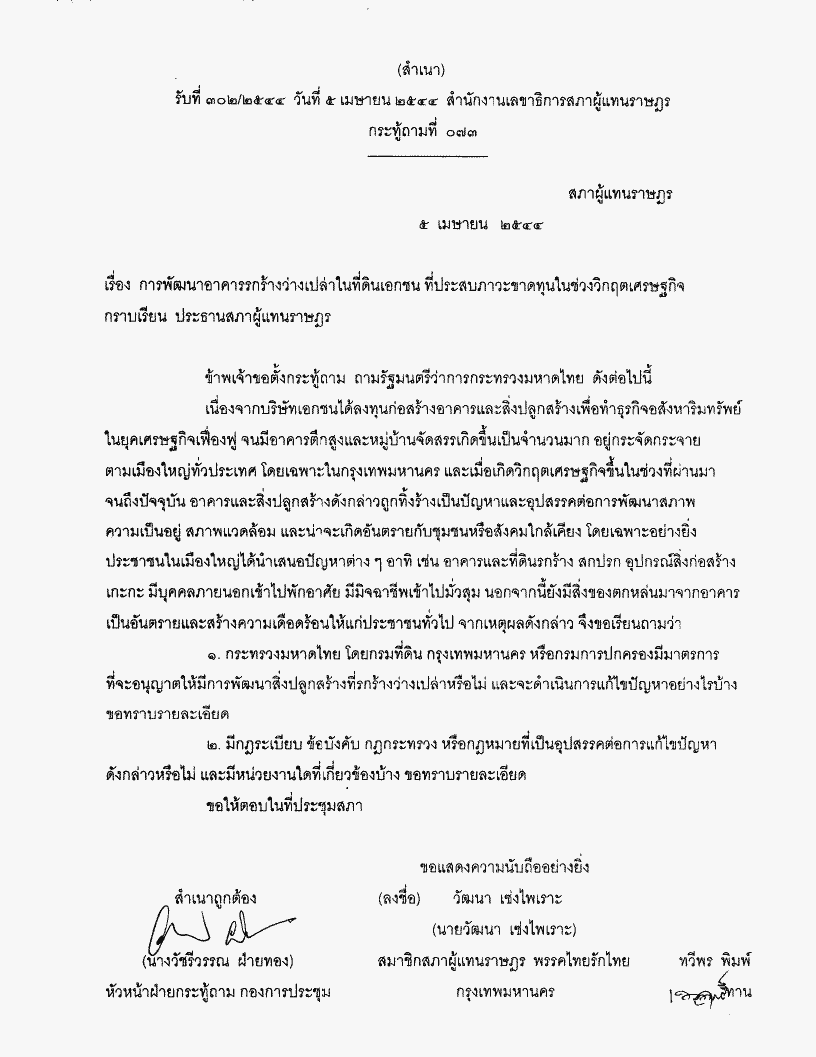 กระทู้ถามที่ 073 เรื่อง การพัฒนาอาคารรกร้างวางเปล่าในที่ดินเอกชน ที่ประสบภาวะขาดทุนในช่วงวิกฤตเศรษฐกิจ นายวัฒนา เซ่งไพเราะ เป็นผู้ตั้งกระทู้ถาม ถามรัฐมนตรีว่าการกระทรวงมหาดไทย |