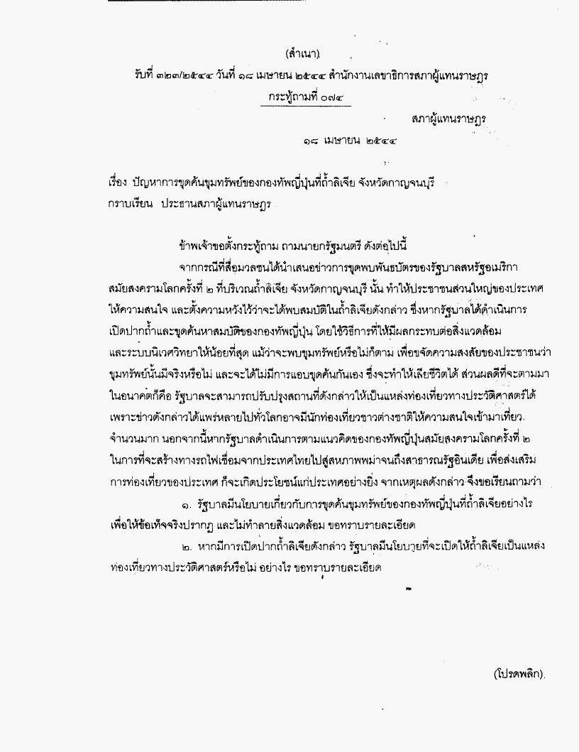 • กระทู้ถามที่ 074 เรื่อง ปัญหาการขุดค้นขุมทรัพย์ของกองทัพญี่ปุ่นที่ถ้ำลิเจีย จังหวัดกาญจนบุรี นายพินิจ จันทร์สมบูรณ์ เป็นผู้ตั้งกระทู้ถาม ถามนายกรัฐมนตรี