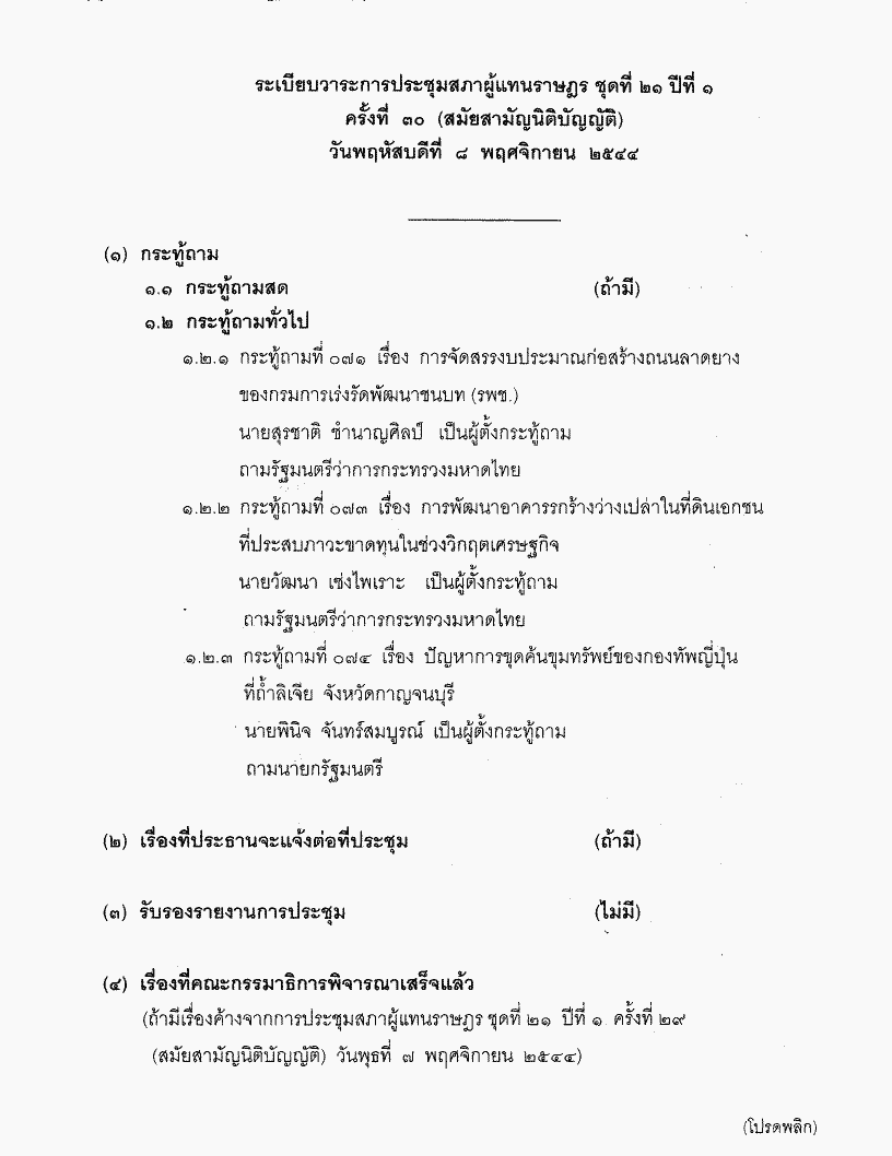 ระเบียบวาระการประชุมสภาผู้แทนราษฎร ชุดที่ 21 ปีที่ 1 ครั้งที่ 30 (สมัยสามัญนิติบัญญัติ) วันพฤหัสบดีที่ 8 พฤศจิกายน 2544 |