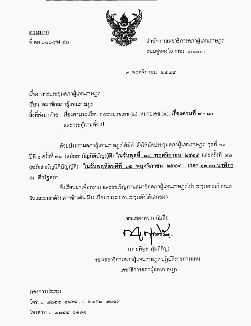 • ระเบียบวาระการประชุมสภาผู้แทนราษฎร ชุดที่ 21 ปีที่ 1 ครั้งที่ 31 (สมัยสามัญนิติบัญญัติ) วันพุธที่ 14 พฤศจิกายน 2544