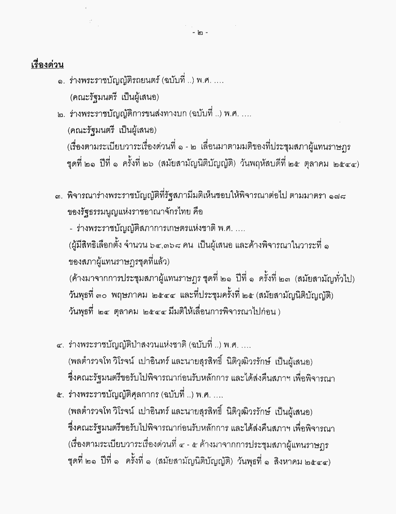 • ระเบียบวาระการประชุมสภาผู้แทนราษฎร ชุดที่ 21 ปีที่ 1 ครั้งที่ 31 (สมัยสามัญนิติบัญญัติ) วันพุธที่ 14 พฤศจิกายน 2544