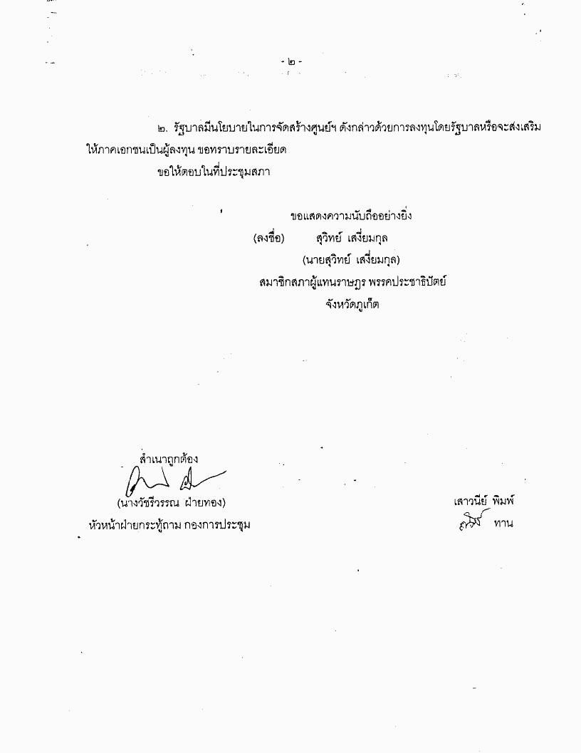 กระทู้ถามที่ 075 เรื่อง การจัดสร้างศูนย์ประชุมและแสดงสินค้านานาชาติที่จังหวัดภูเก็ต นายสุวิทย์ เสงี่ยมกุล เป็นผู้ตั้งกระทู้ถาม ถามนายกรัฐมนตรี |