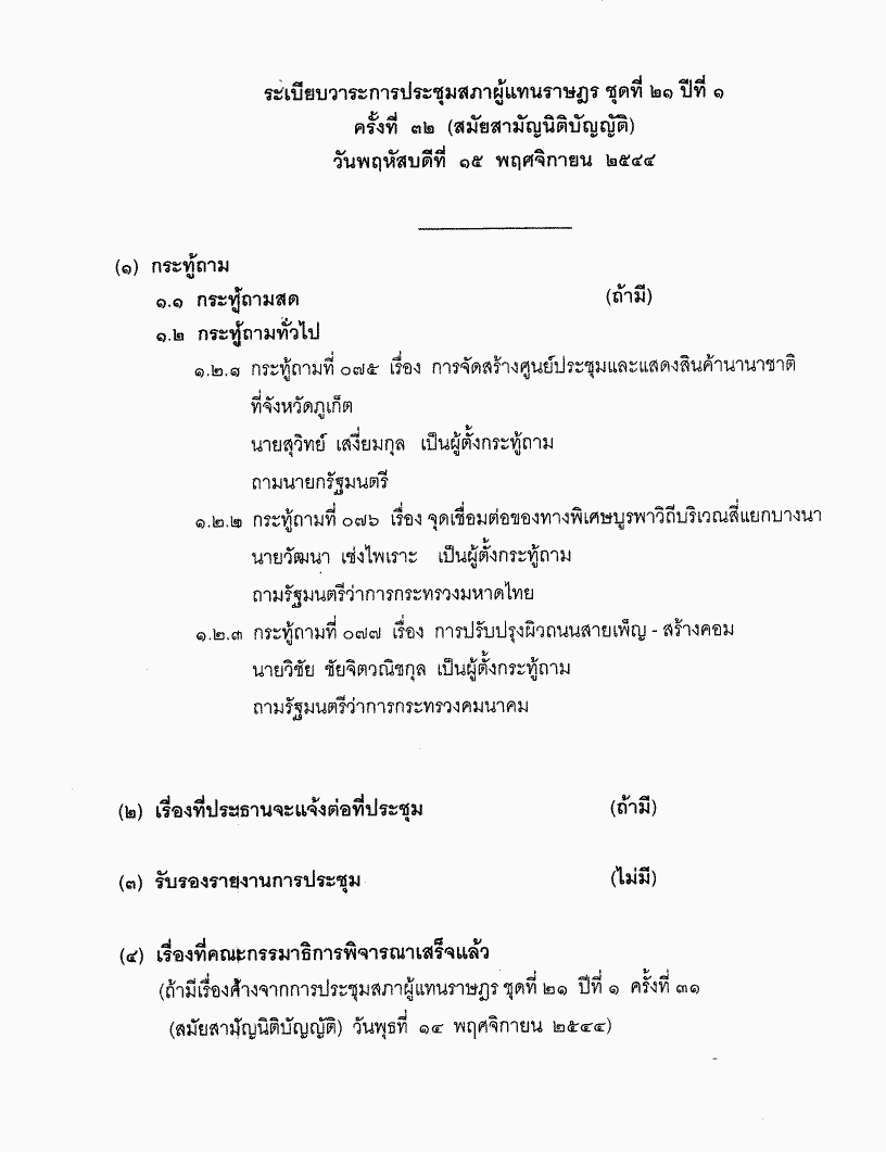 ระเบียบวาระการประชุมสภาผู้แทนราษฎร ชุดที่ 21 ปีที่ 1 ครั้งที่ 32 (สมัยสามัญนิติบัญญัติ) วันพฤหัสบดีที่ 15 พฤศจิกายน 2544 |