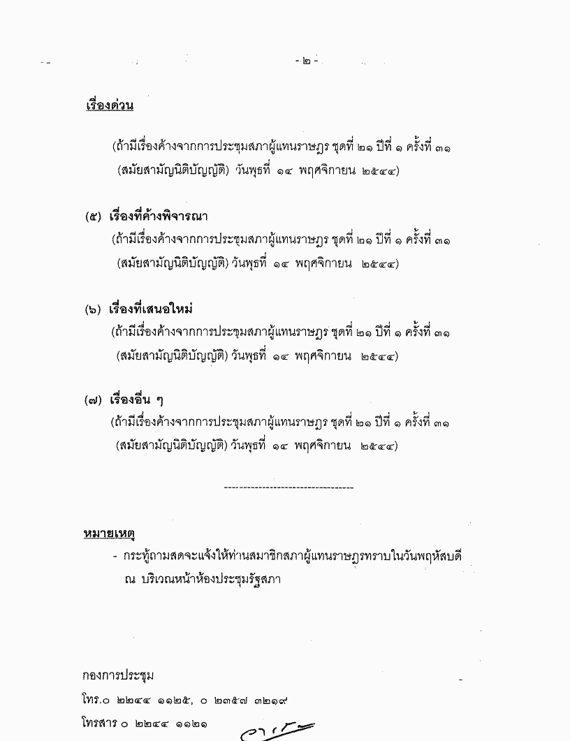 • ระเบียบวาระการประชุมสภาผู้แทนราษฎร ชุดที่ 21 ปีที่ 1 ครั้งที่ 32 (สมัยสามัญนิติบัญญัติ) วันพฤหัสบดีที่ 15 พฤศจิกายน 2544