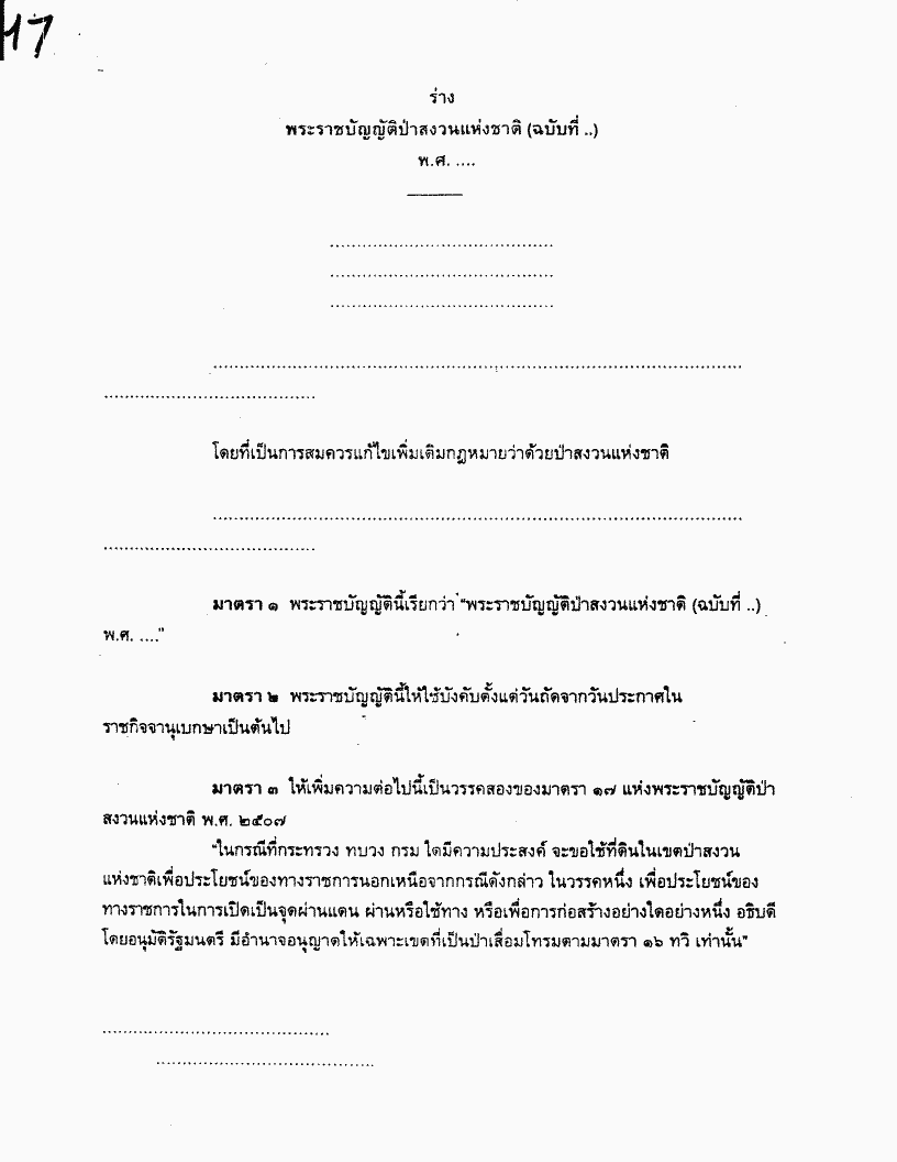 ชื่อเอกสาร :   ร่างพระราชบัญญัติป่าสงวนแห่งชาติ (ฉบับที่..) พ.ศ. .... (พลตำรวจโท วิโรจน์ เปาอินทร์ และนายสุรสิทธิ์ นิติวุฒิวรรักษ์ เป็นผู้เสนอ) ซึ่งคณะรัฐมนตรีขอรับไปพิจารณาก่อนรับหลักการ และได้ส่งคืนสภาฯ เพื่อพิจารณา