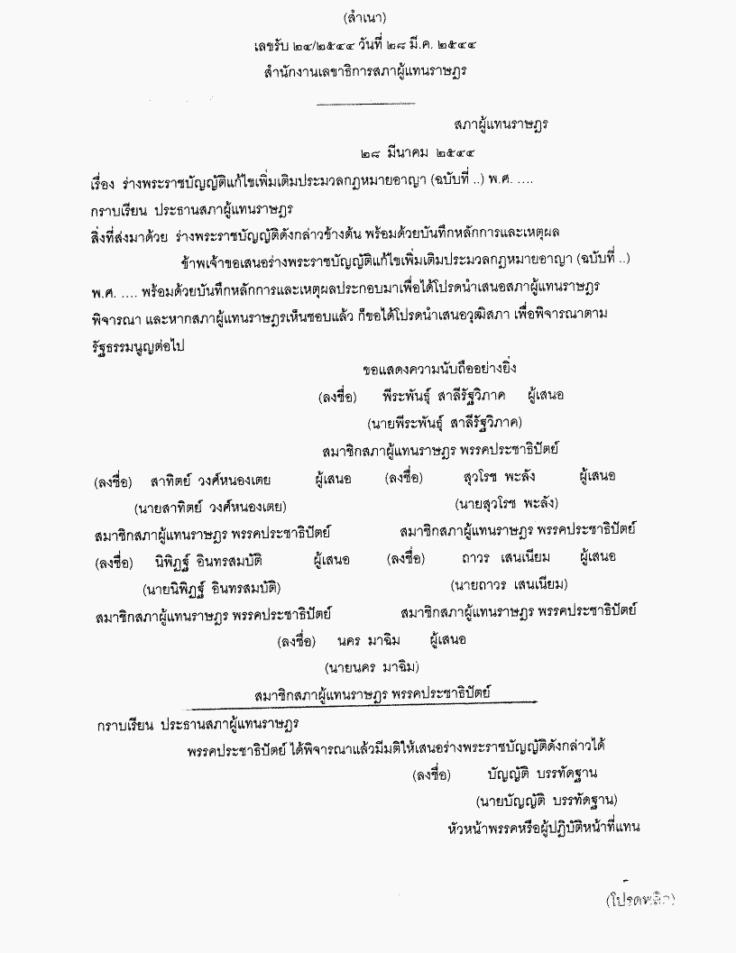 • ร่างพระราชบัญญัติแก้ไขเพิ่มเติมประมวลกฎหมายอาญา (ฉบับที่..) พ.ศ..... (นายพีระพันธุ์ สาลีรัฐวิภาค กับคณะ เป็นผู้เสนอ) และร่างพระราชบัญญัติแก้ไขเพิ่มเติมประมวลกฎหมายอาญา(ฉบับที่..) พ.ศ. .... (นายสุรสิทธิ์ นิติวุฒิวรรักษ์ กับคณะ เป็นผู้เสนอ)