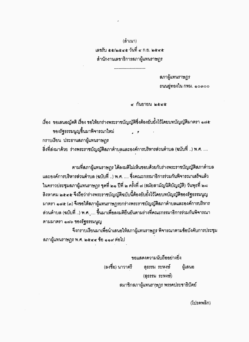 • ขอเสนอญัตติ เรื่อง ขอให้ยกร่างพระราชบัญญัติซึ่งต้องยับยั้งไว้โดยบทบัญญัติมาตรา 175