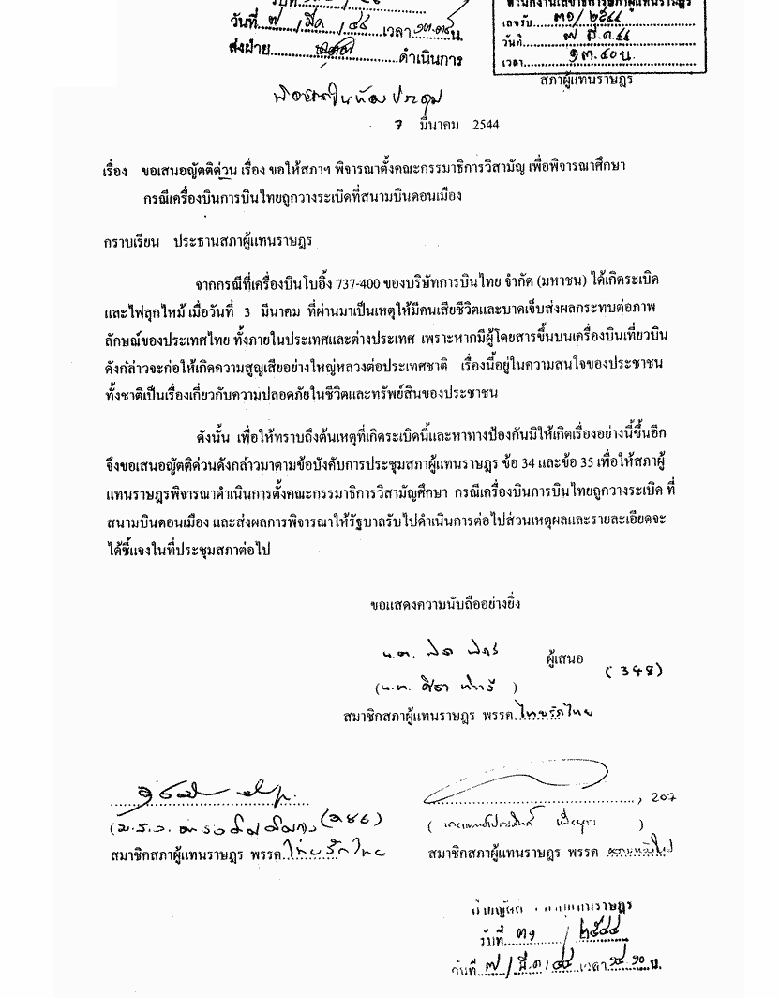 • ญัตติด่วน เรื่อง ขอให้สภาฯ พิจารณาตั้งคณะกรรมาธิการวิสามัญ เพื่อพิจารณาศึกษากรณีเครื่องบินการบินไทยถูกวางระเบิดที่สนามบินดอนเมือง