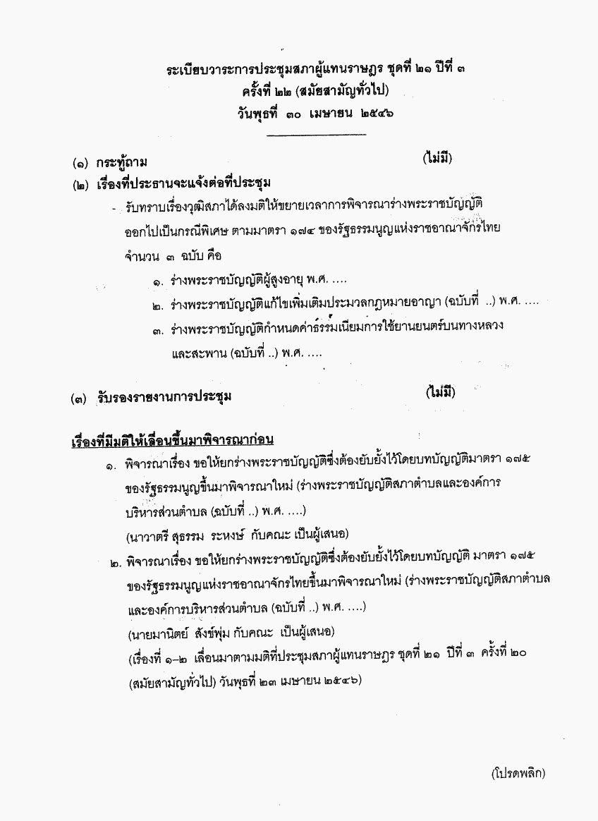 ระเบียบวาระการประชุมสภาผู้แทนราษฎร ชุดที่ 21 ปีที่ 3 ครั้งที่ 22 (สมัยสามัญทั่วไป) วันพุธที่ 30 เมษายน 2546 |