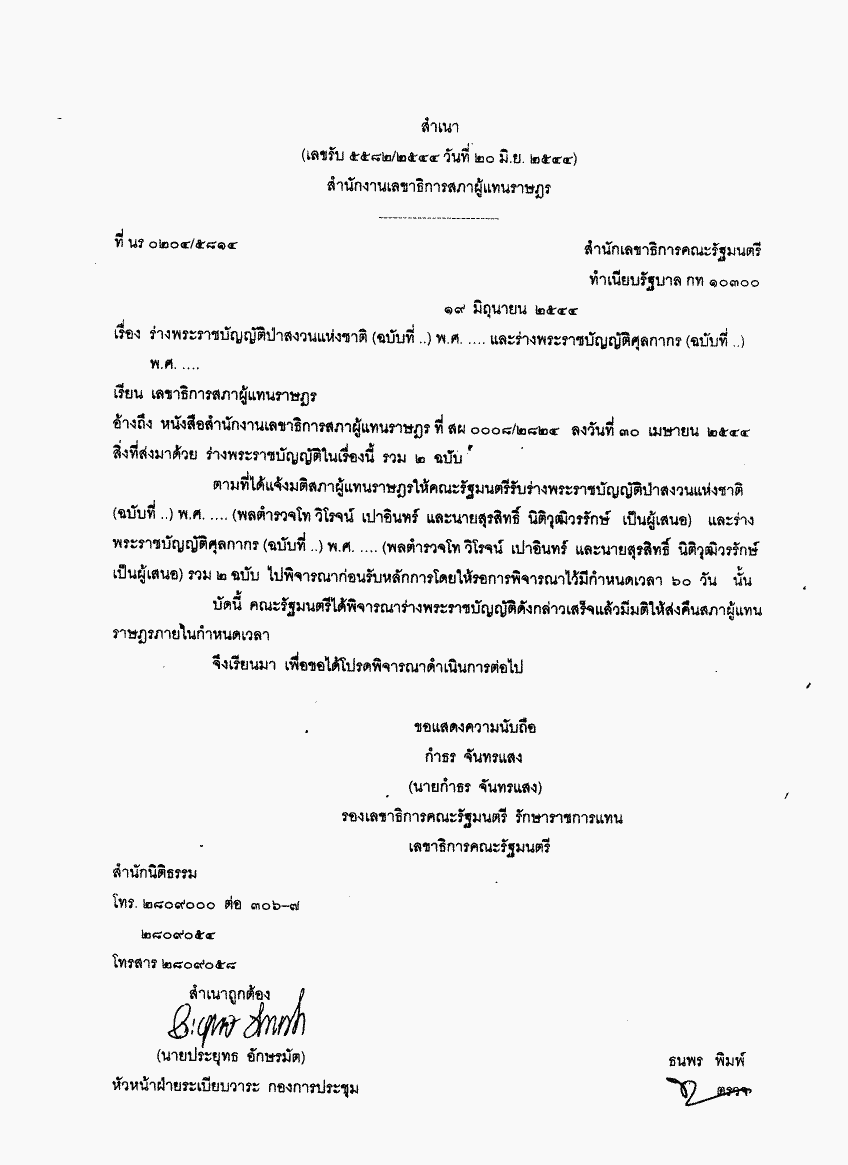 ชื่อเอกสาร :   ร่างพระราชบัญญัติป่าสงวนแห่ชาติ (ฉบับที่ ..) พ.ศ. .... (พลตำรวจโท วิโรจน์ เปาอินทร์ และนายสุรสิทธิ์ นิติวุฒิวรรักษ์ เป็นผู้เสนอ) ซึ่งคณะรัฐมนตรีขอรับไปพิจารณาก่อนรับหลักการ และได้ส่งคืนสภาฯ เพื่อพิจารณา