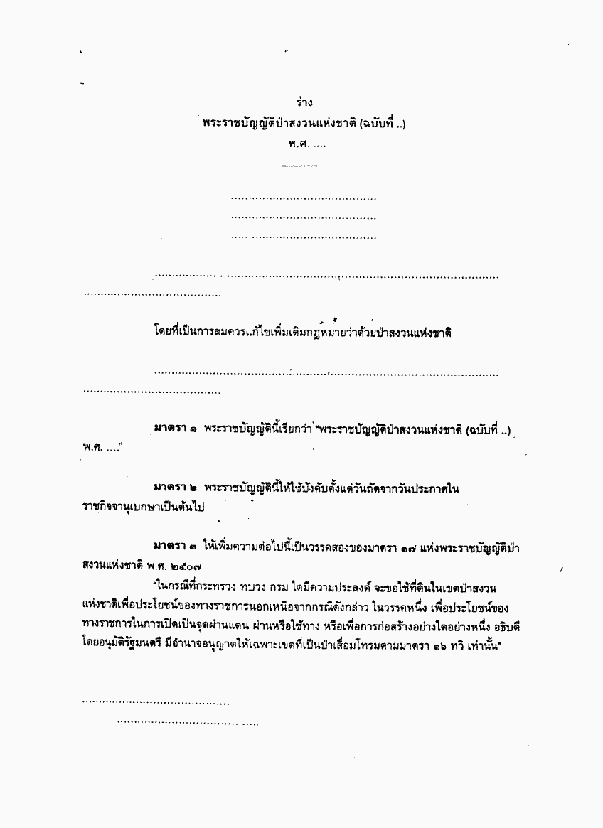 ชื่อเอกสาร :   ร่างพระราชบัญญัติป่าสงวนแห่ชาติ (ฉบับที่ ..) พ.ศ. .... (พลตำรวจโท วิโรจน์ เปาอินทร์ และนายสุรสิทธิ์ นิติวุฒิวรรักษ์ เป็นผู้เสนอ) ซึ่งคณะรัฐมนตรีขอรับไปพิจารณาก่อนรับหลักการ และได้ส่งคืนสภาฯ เพื่อพิจารณา