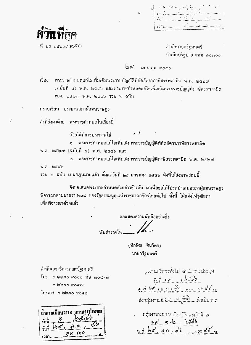 • พระราชกำหนดแก้ไขเพิ่มเติมพระราชบัญญัติพิกัดอัตราภาษีสรรพสามิต พ.ศ. 2527 (ฉบับที่ 4) พ.ศ. 2546 (คณะรัฐมนตรี เป็นผู้เสนอ)
