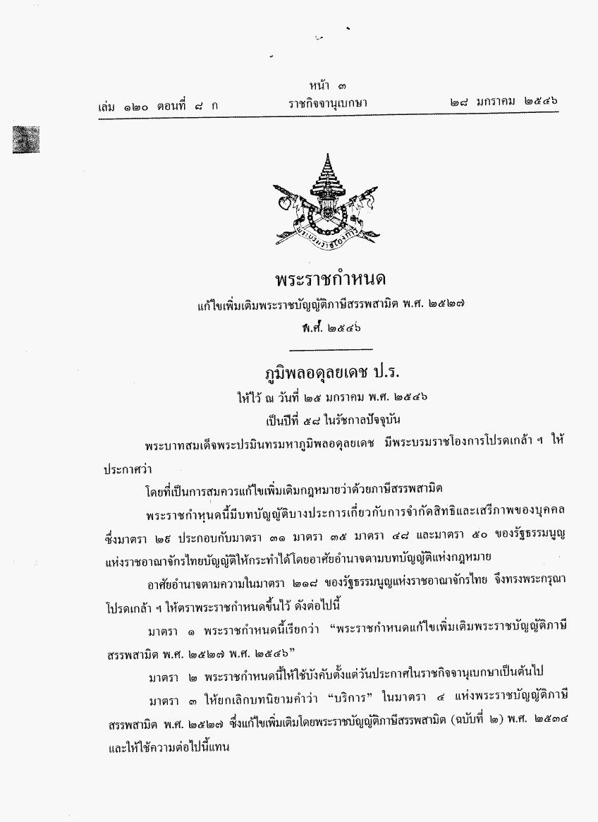 • พระราชกำหนดแก้ไขเพิ่มเติมพระราชบัญญัติพิกัดอัตราภาษีสรรพสามิต พ.ศ. 2527 (ฉบับที่ 4) พ.ศ. 2546 และพระราชกำหนดแก้ไขเพิ่มเติมพระราชบัญญัติภาษีสรรพสามิต พ.ศ. 2427 พ.ศ 2546 รวม 2 ฉบับ