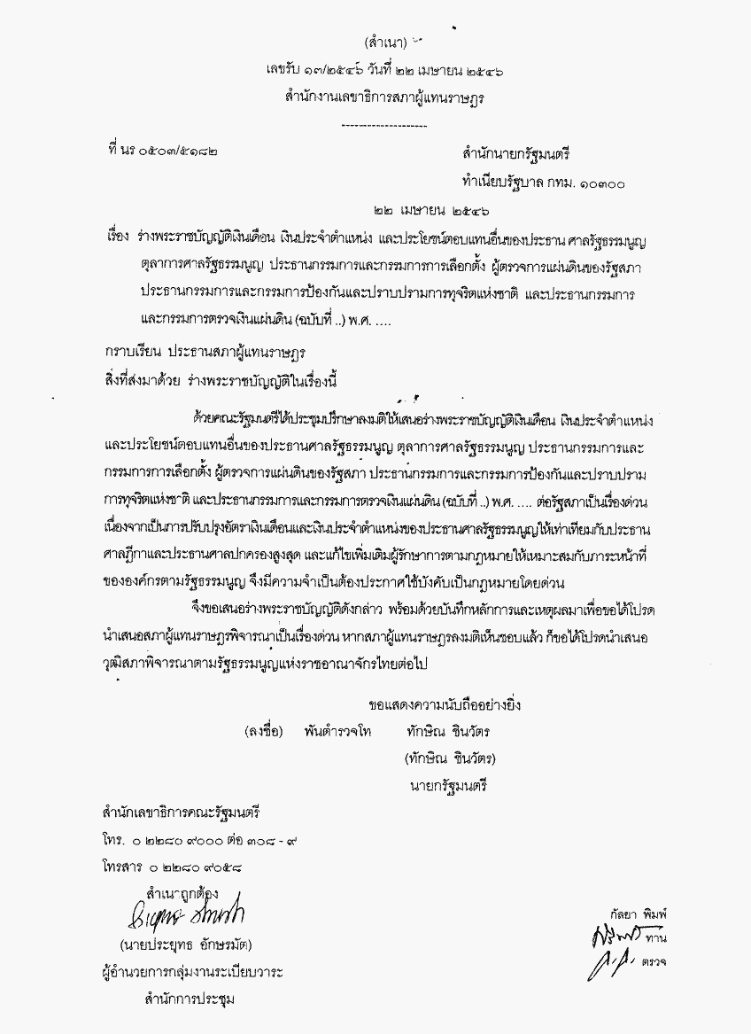 • ร่างพระราชบัญญัติเงินดือน เงินประจำตำแหน่ง และประโยนช์ตอบแทนอื่นของประธานศาลรัฐธรรมนูญตุลาการศาลรัฐธรฌนูญ ประธานกรรมการและกรรมการการเลือกตั้ง ผู้ตรวจการแผ่นดินของรัฐสภาประธานกรรมการและกรรมการป้องกันและปราบปรามการทุจริตแห่งชาติ และประธานกรรมการและกรรมการตรวจเงินแผ่นดิน (ฉบับที่ ..) พ.ศ. .... (คณะรัฐมนตรี เป็นผู้เสนอ)