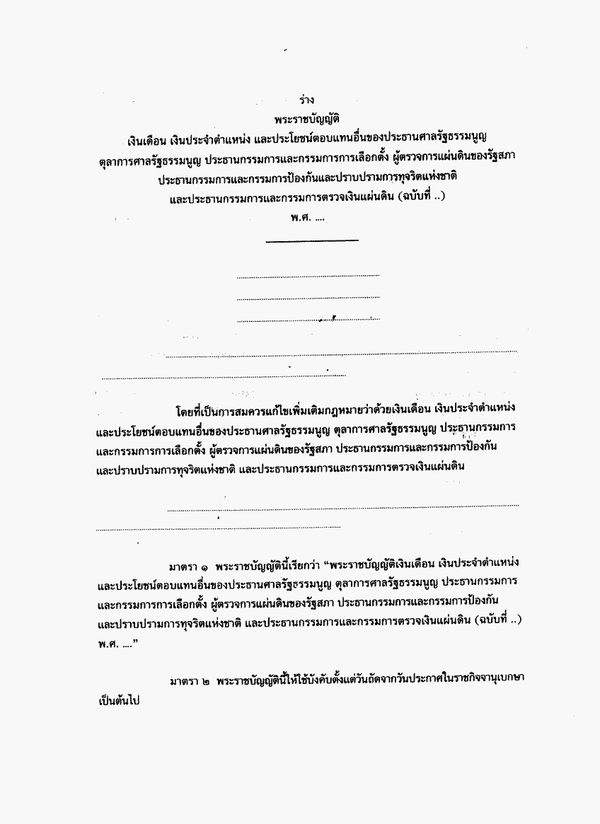 • ร่างพระราชบัญญัติเงินดือน เงินประจำตำแหน่ง และประโยนช์ตอบแทนอื่นของประธานศาลรัฐธรรมนูญตุลาการศาลรัฐธรฌนูญ ประธานกรรมการและกรรมการการเลือกตั้ง ผู้ตรวจการแผ่นดินของรัฐสภาประธานกรรมการและกรรมการป้องกันและปราบปรามการทุจริตแห่งชาติ และประธานกรรมการและกรรมการตรวจเงินแผ่นดิน (ฉบับที่ ..) พ.ศ. ....