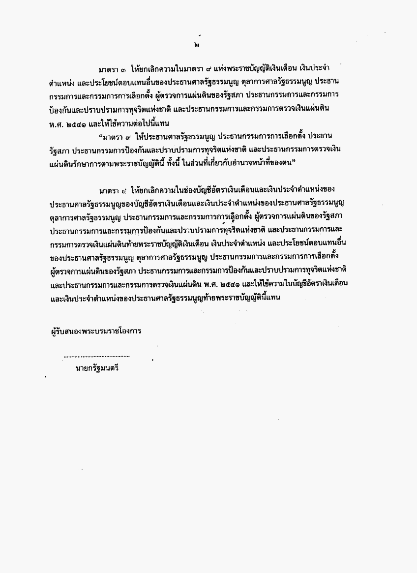 • ร่างพระราชบัญญัติเงินดือน เงินประจำตำแหน่ง และประโยนช์ตอบแทนอื่นของประธานศาลรัฐธรรมนูญตุลาการศาลรัฐธรฌนูญ ประธานกรรมการและกรรมการการเลือกตั้ง ผู้ตรวจการแผ่นดินของรัฐสภาประธานกรรมการและกรรมการป้องกันและปราบปรามการทุจริตแห่งชาติ และประธานกรรมการและกรรมการตรวจเงินแผ่นดิน (ฉบับที่ ..) พ.ศ. .... (คณะรัฐมนตรี เป็นผู้เสนอ)