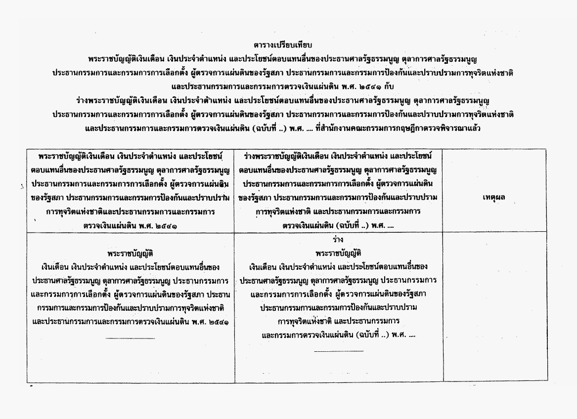 ร่างพระราชบัญญัติเงินดือน เงินประจำตำแหน่ง และประโยนช์ตอบแทนอื่นของประธานศาลรัฐธรรมนูญตุลาการศาลรัฐธรฌนูญ ประธานกรรมการและกรรมการการเลือกตั้ง ผู้ตรวจการแผ่นดินของรัฐสภาประธานกรรมการและกรรมการป้องกันและปราบปรามการทุจริตแห่งชาติ และประธานกรรมการและกรรมการตรวจเงินแผ่นดิน (ฉบับที่ ..) พ.ศ. .... |