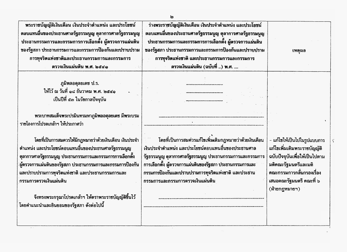 • ร่างพระราชบัญญัติเงินดือน เงินประจำตำแหน่ง และประโยนช์ตอบแทนอื่นของประธานศาลรัฐธรรมนูญตุลาการศาลรัฐธรฌนูญ ประธานกรรมการและกรรมการการเลือกตั้ง ผู้ตรวจการแผ่นดินของรัฐสภาประธานกรรมการและกรรมการป้องกันและปราบปรามการทุจริตแห่งชาติ และประธานกรรมการและกรรมการตรวจเงินแผ่นดิน (ฉบับที่ ..) พ.ศ. .... (คณะรัฐมนตรี เป็นผู้เสนอ)