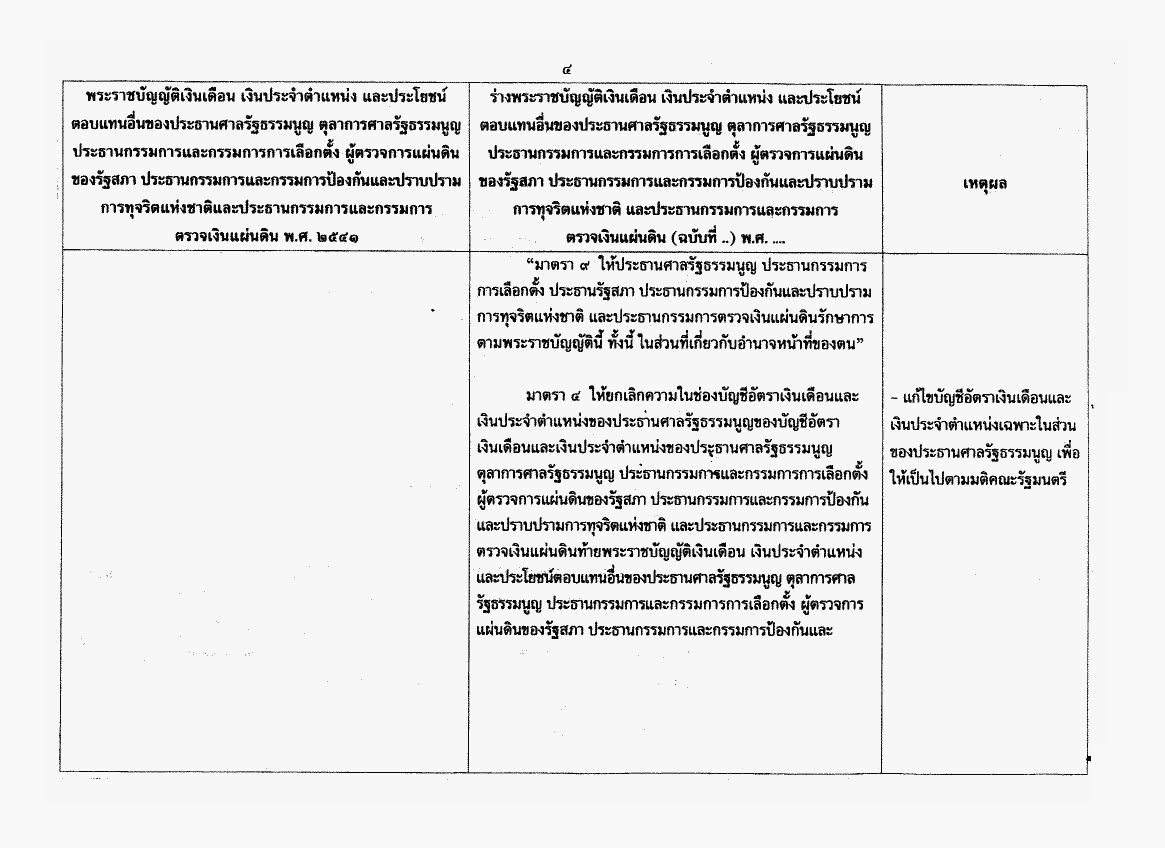 • ร่างพระราชบัญญัติเงินดือน เงินประจำตำแหน่ง และประโยนช์ตอบแทนอื่นของประธานศาลรัฐธรรมนูญตุลาการศาลรัฐธรฌนูญ ประธานกรรมการและกรรมการการเลือกตั้ง ผู้ตรวจการแผ่นดินของรัฐสภาประธานกรรมการและกรรมการป้องกันและปราบปรามการทุจริตแห่งชาติ และประธานกรรมการและกรรมการตรวจเงินแผ่นดิน (ฉบับที่ ..) พ.ศ. .... (คณะรัฐมนตรี เป็นผู้เสนอ)