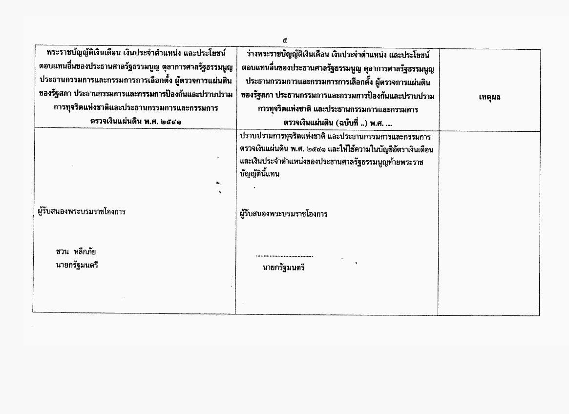 • ร่างพระราชบัญญัติเงินดือน เงินประจำตำแหน่ง และประโยนช์ตอบแทนอื่นของประธานศาลรัฐธรรมนูญตุลาการศาลรัฐธรฌนูญ ประธานกรรมการและกรรมการการเลือกตั้ง ผู้ตรวจการแผ่นดินของรัฐสภาประธานกรรมการและกรรมการป้องกันและปราบปรามการทุจริตแห่งชาติ และประธานกรรมการและกรรมการตรวจเงินแผ่นดิน (ฉบับที่ ..) พ.ศ. .... (คณะรัฐมนตรี เป็นผู้เสนอ)