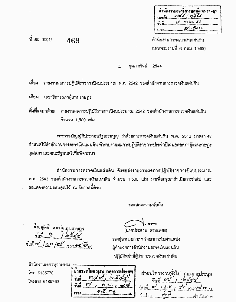 ๒.๑ พิจารณารายงานผลการปฏิบัติราชการ ปีงบประมาณ พ.ศ. ๒๕๔๒ ของสำนักงานการตรวจเงินแผ่นดิน ตามพระราชบัญญัติประกอบรัฐธรรมนูญว่าด้วยกาตรวจเงินแผ่นดิน พ.ศ. ๒๕๔๒ มาตรา ๔๘ |
